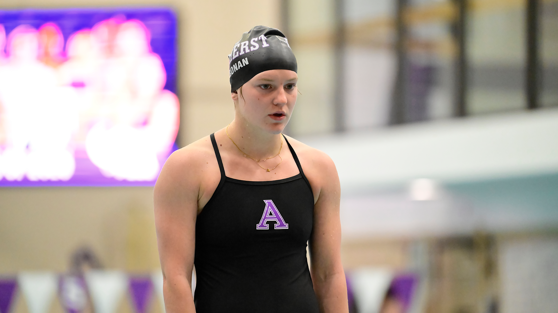 Sydney Bluestein of the Amherst College women's swimming and diving team finished third in three-meter diving while junior